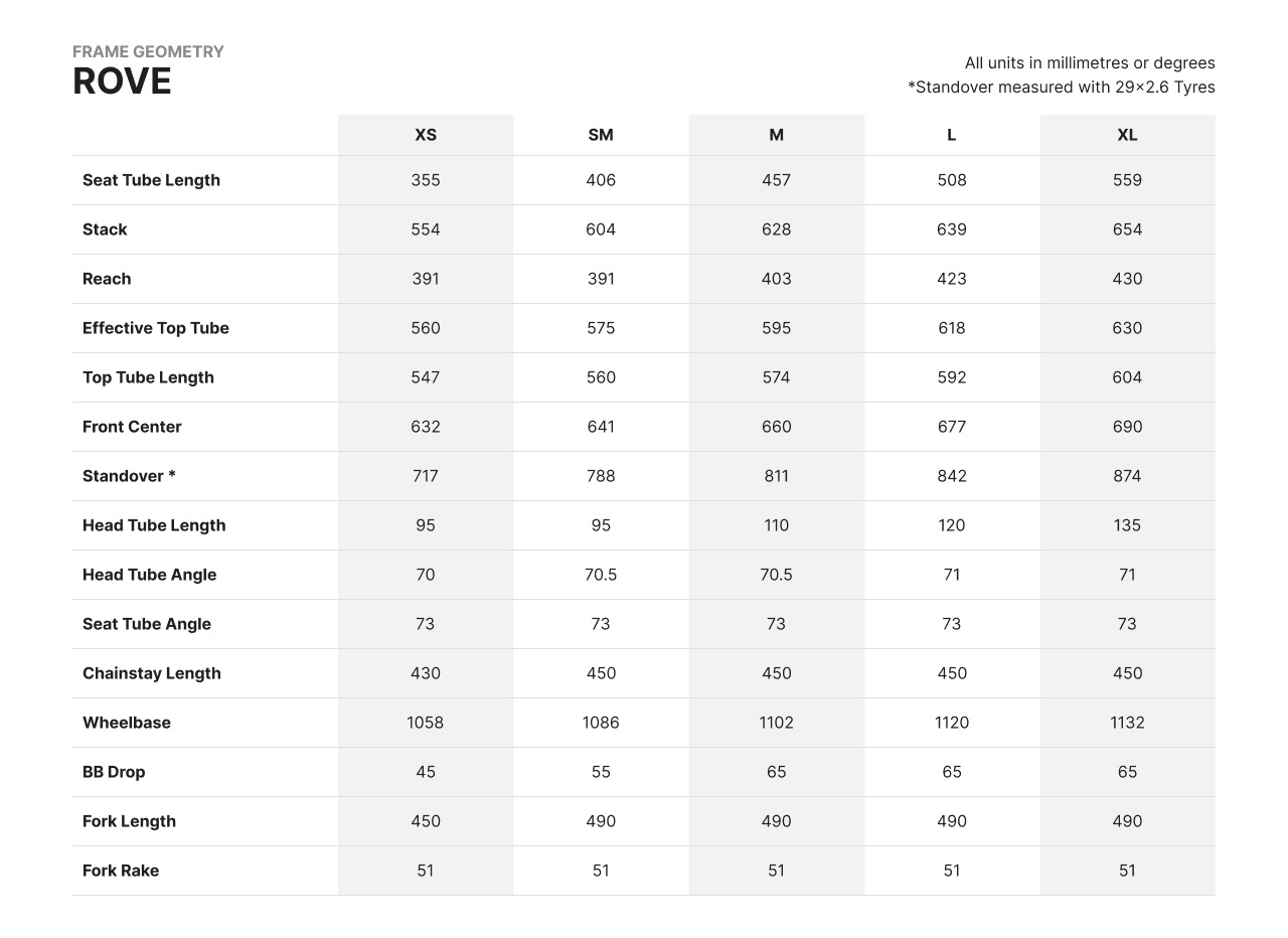 | Description | The Rove has been developed from a strong desire for travel. A bike that will give you the ability to be truly free, not limited by performance, tyre size or luggage carrying ability. With geometry based around flat bars and mountain bike components to inspire confidence and resilience in the toughest of conditions. Available in a wide range or sizes to suit everyone; the smallest of which utilises 27.5" wheels to improve manoeuvrability, while the larger sizes take advantage of the smooth rolling characteristics 29" wheels have to offer. The frame has a full array of mounts with the ability to fit mudguards, traditional front and rear panniers, three bottles, and there are additional cage mounts on the forks. As with many Spa Cycles frames, the Rove is available in super-dependable Reynolds 725 steel (from March 2023), or 3Al2.5V Titanium if you desire the ultimate off-road adventure machine. If you truly have the urge to ride without limits the Rove should be at the top of your kit list! Frame - Reynolds 725 Steel. ED-coated for added corrosion resistance Forks - Spa Cycles Rove (Boost 15x110mm Thru Axle) Cro-Mo Steel with post-mount caliper fitting. Colour-matched to frame. Steel Fork Weight (with uncut steerer): 1.6kg (650B) 1.8kg (700C) (Rove Full Carbon Fork available +£80. Please select in Extra Options if required). Not available on XS (14"). Rear Axle - Boost 12x148mm Thru Axle. Carbon Fork Weight (with uncut steerer): Standard Carbon: 680grams Gravel Carbon: 480gms Maximum disc rotor size (front & rear): 180mm Average Frame Weight (inc sliding droputs): XS (14") 2.5kg S (16") 2.6kg M (18") 2.7kg L (20") 2.8kg XL (22") 3kg Price includes frame and Cro-Mo Steel forks. The frame's headtube and BB shell will be faced. Headset not included (Recommended headset: FSA Orbit ITA). The headset will be fitted if purchased with the frameset. |