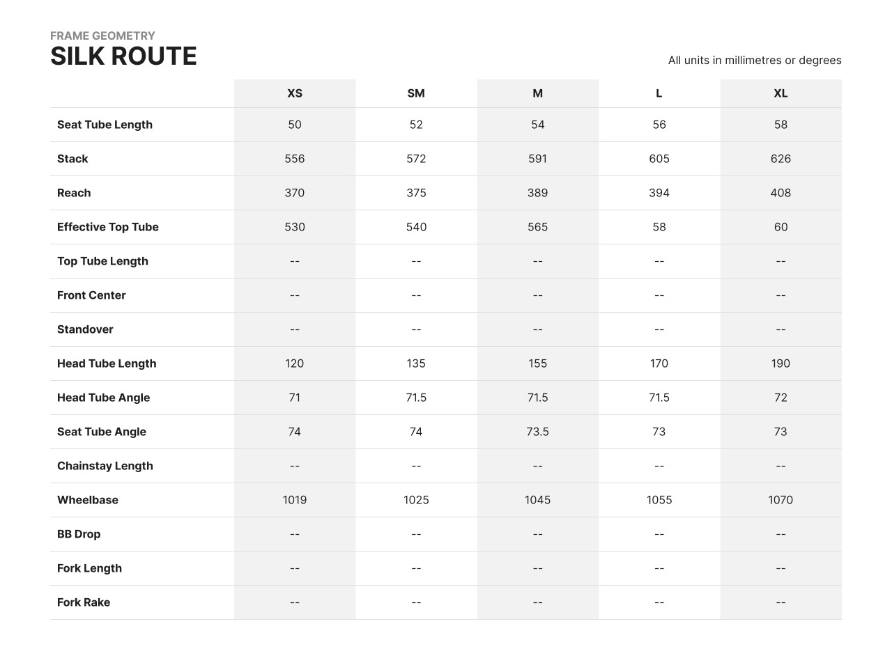 | Style | Super stable geometry: Designed to give a sure footed ride wherever you intend going. Custom spec differs from std Sabbath spec Comfort: 3Al 2.5V straight gauge seamless titanium tubeset with some tube manipulation to maximize comfort over any terrain. Optimised braking: Designed with cantilever brake mounts to ensure maximum control and clearance with even the heaviest of loads Maximized tyre clearance: The Silk Route is designed to accommodate upto 38c tyres with mudguards fitted. |