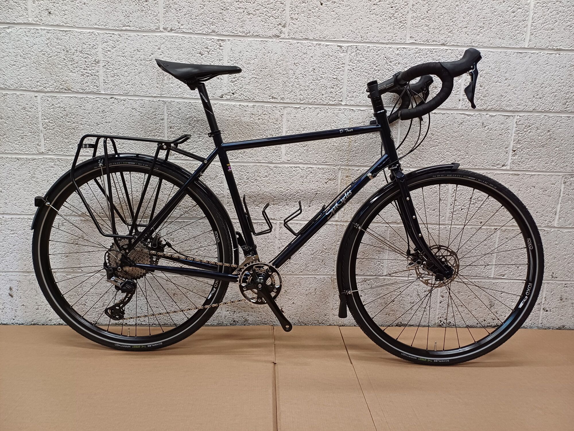 Style Our acclaimed disc braked Expedition Touring Bike. Shares much of it's DNA with the Spa Tourer. The frame is built from ovalized Reynolds 725 tubing to give the stiffness needed for heavy load carrying with the compliance needed for long days in the saddle. Wide tyre clearance 40mm (with mudguards), three sets of bottle bosses, rack mounts, mudguard eyes. It comes equipped with handbuilt wheels, wide range touring gearing and quality components including a Tubus rack, leather saddle, Schwalbe Marathon tyres and SKS mudguards.